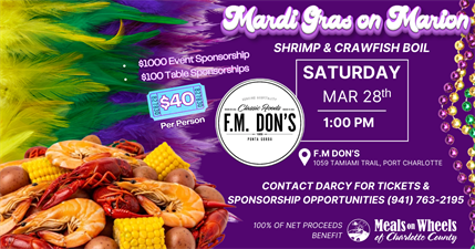 Join us for a Shrimp & Crawfish Boil that truly makes a difference. Savor a delicious meal while helping provide warm, nutritious meals to elderly residents who rely on us of Charlotte County.